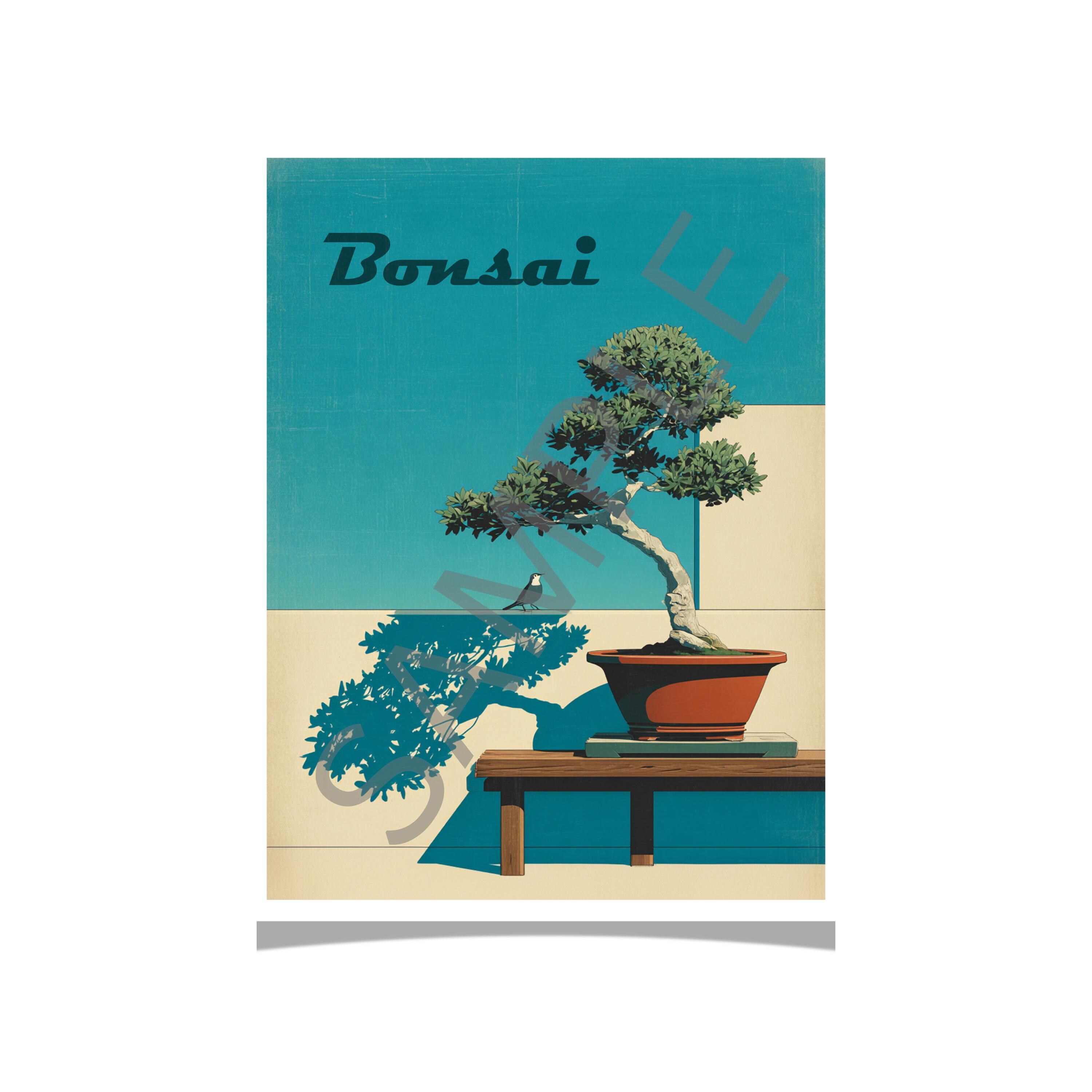 This poster features a bonsai tree as the focal point, set against a minimalist architectural background with a little bird on a wall.