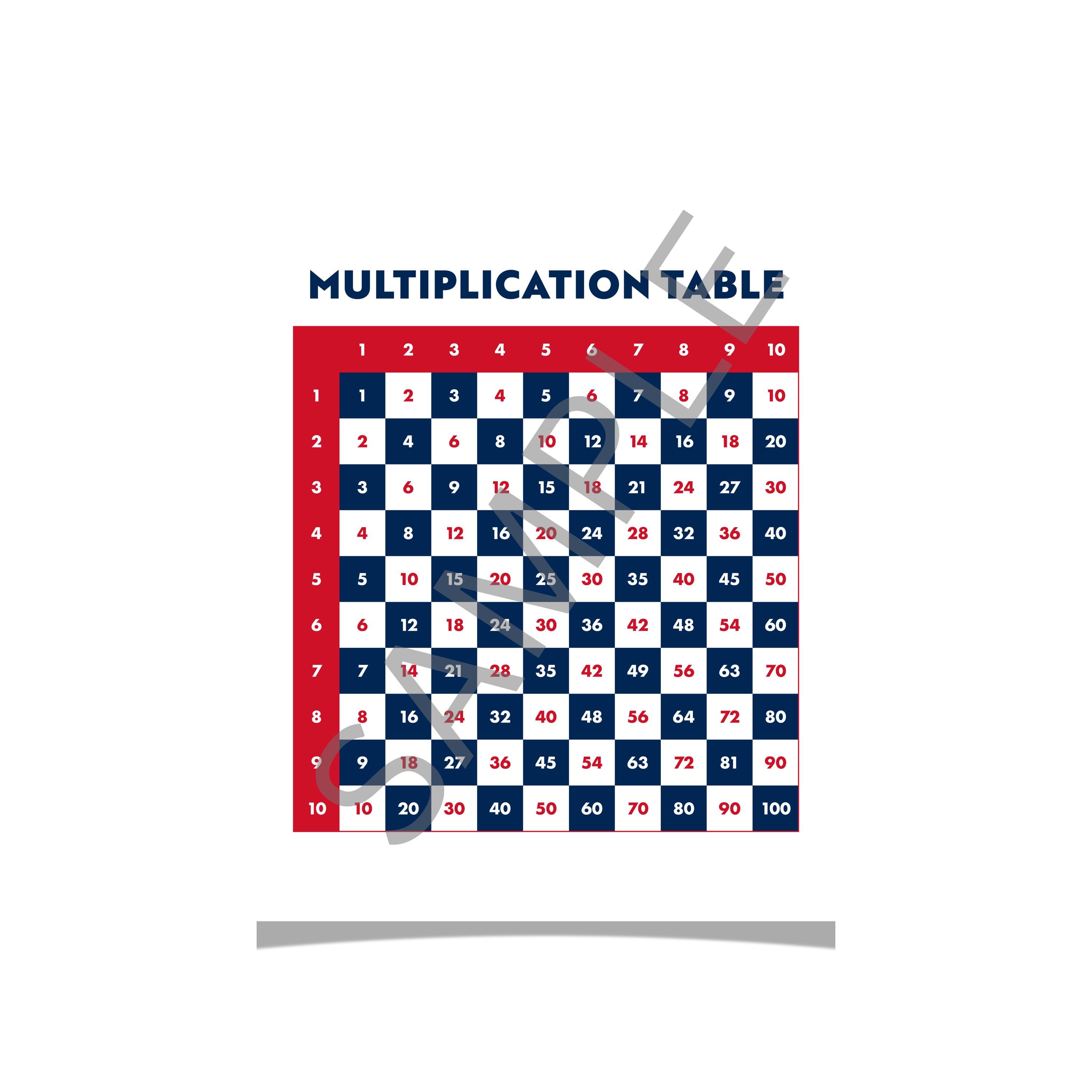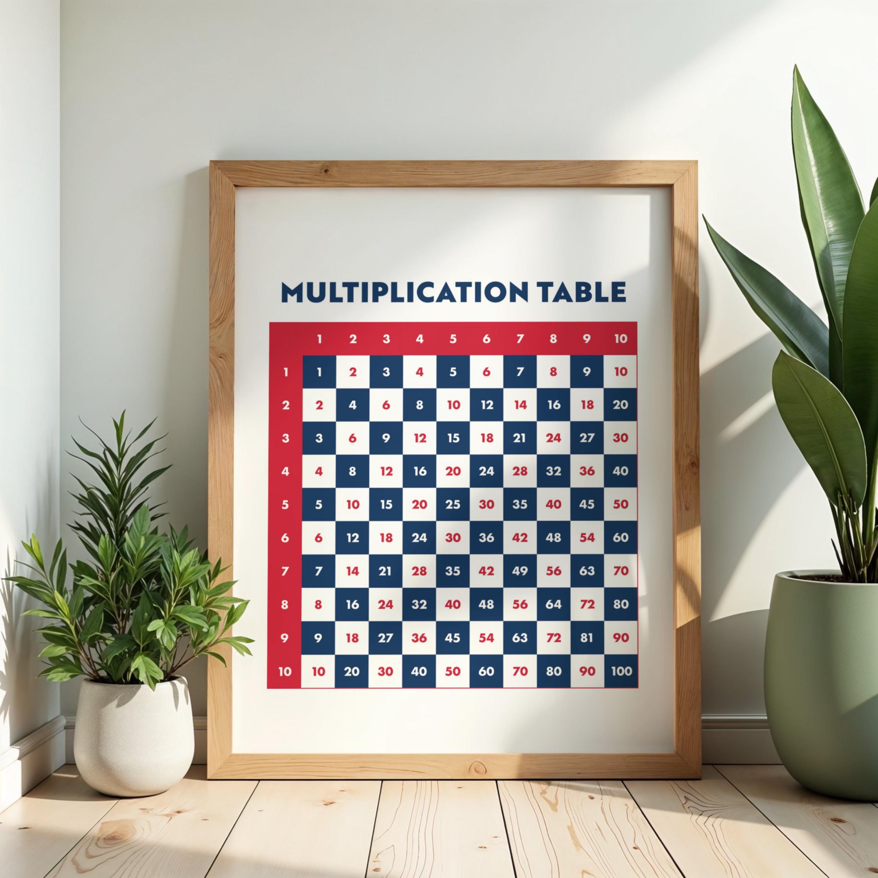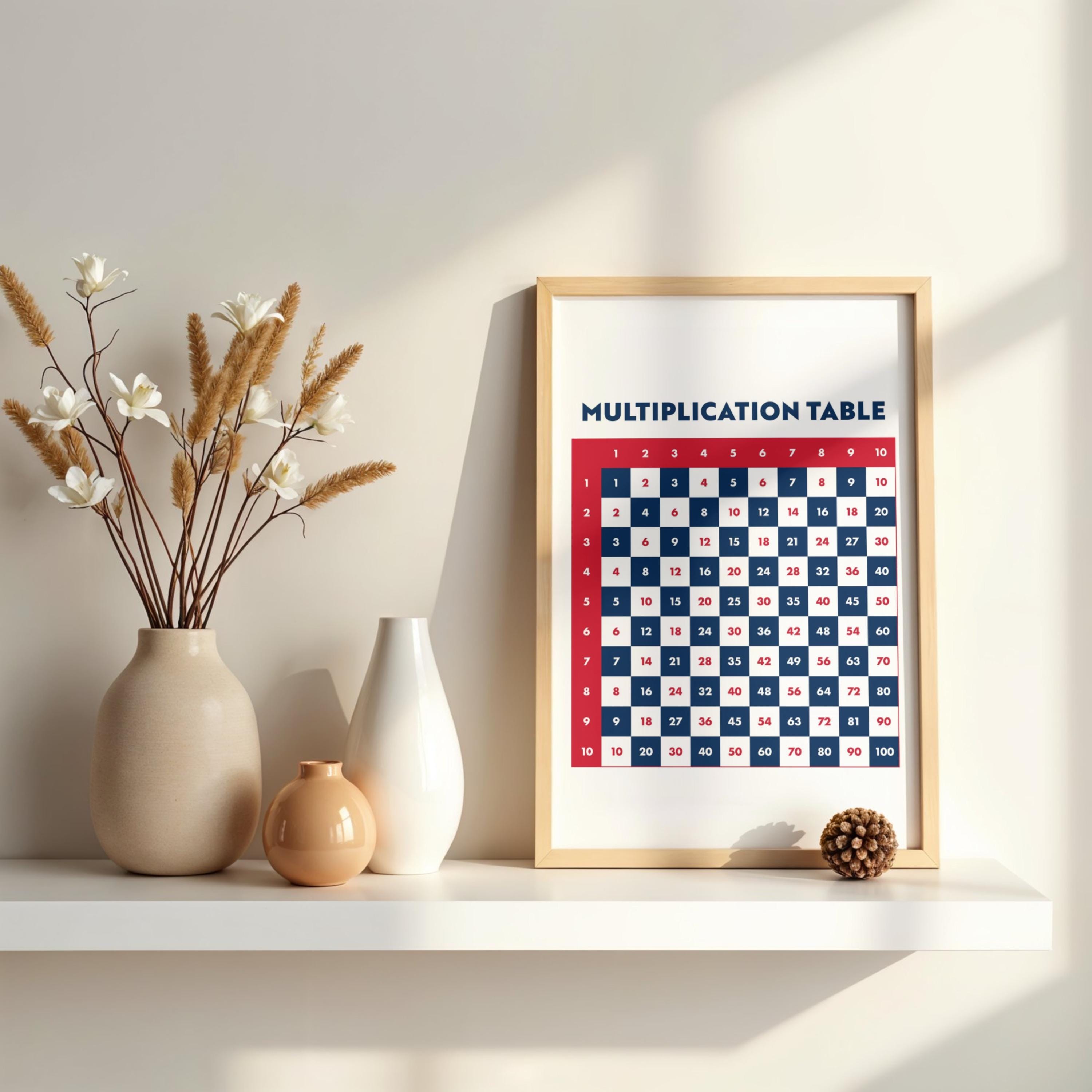 Master the times tables with style. This minimalist multiplication table features a classic checkered pattern with tricolor. A perfect blend of educational value and modern graphic design for your child's learning space.