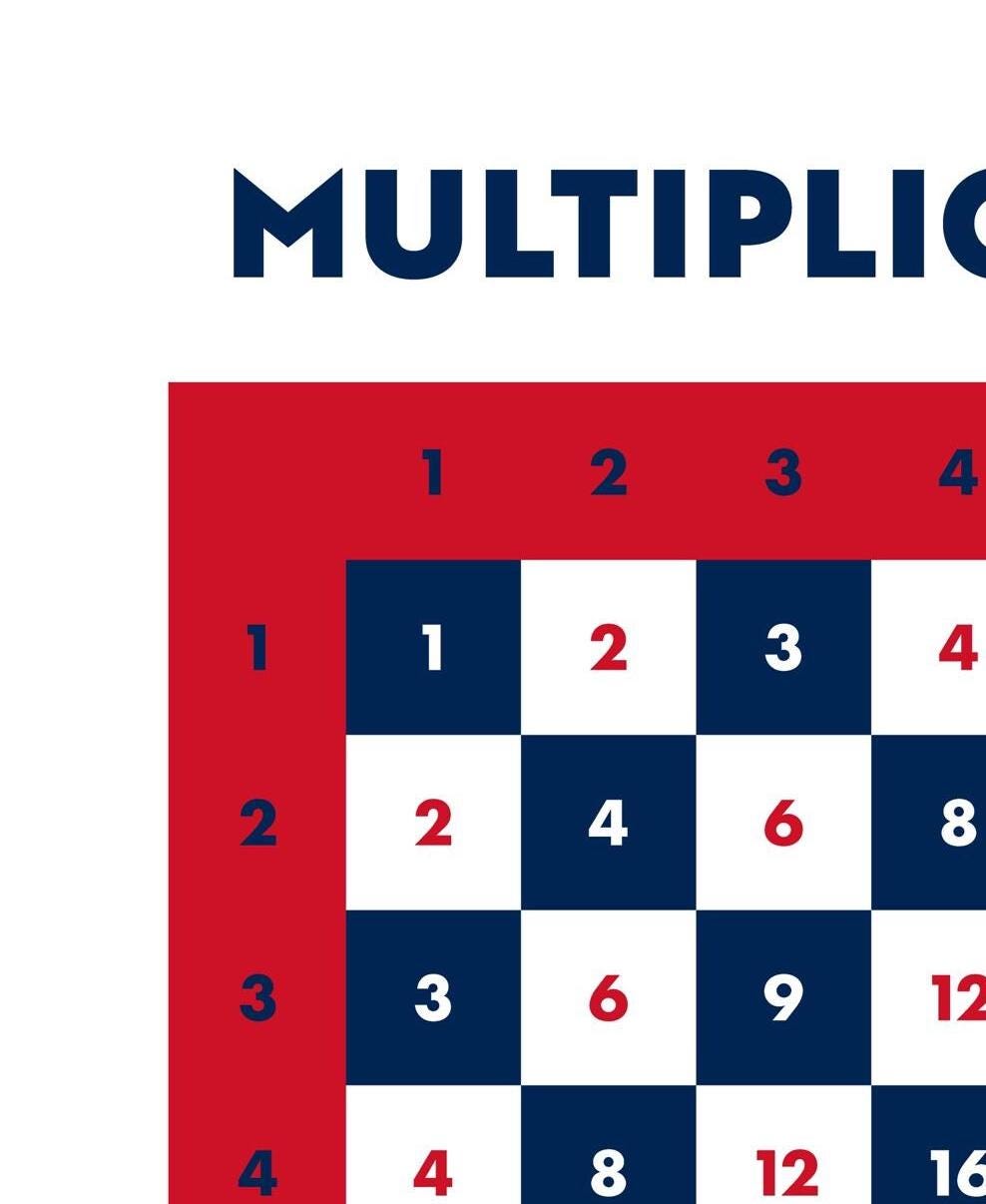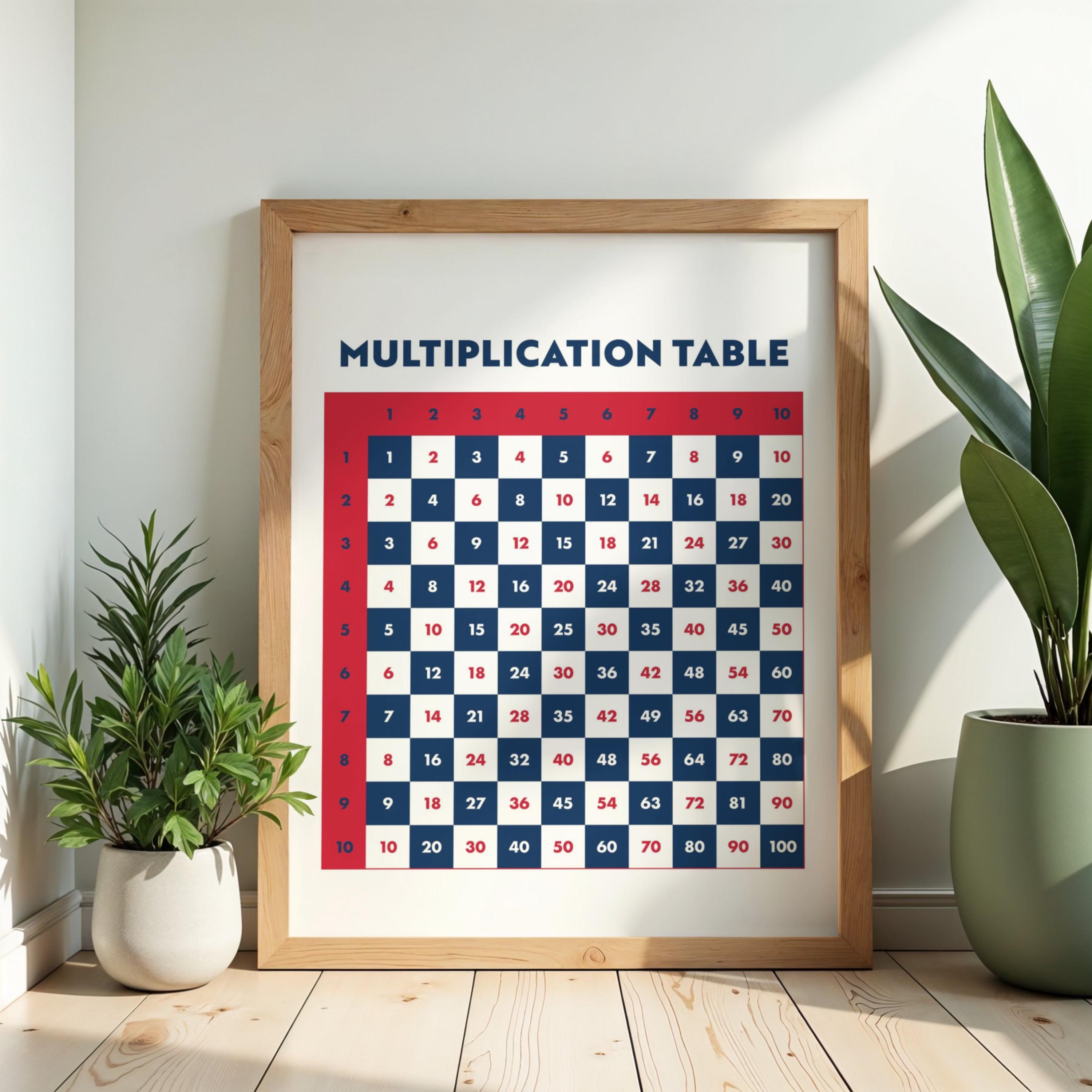 Master the times tables with style. This minimalist $10 \times 10$ multiplication grid features a classic checkered pattern and bold primary colors. A perfect blend of educational value and modern graphic design for your child's learning space.