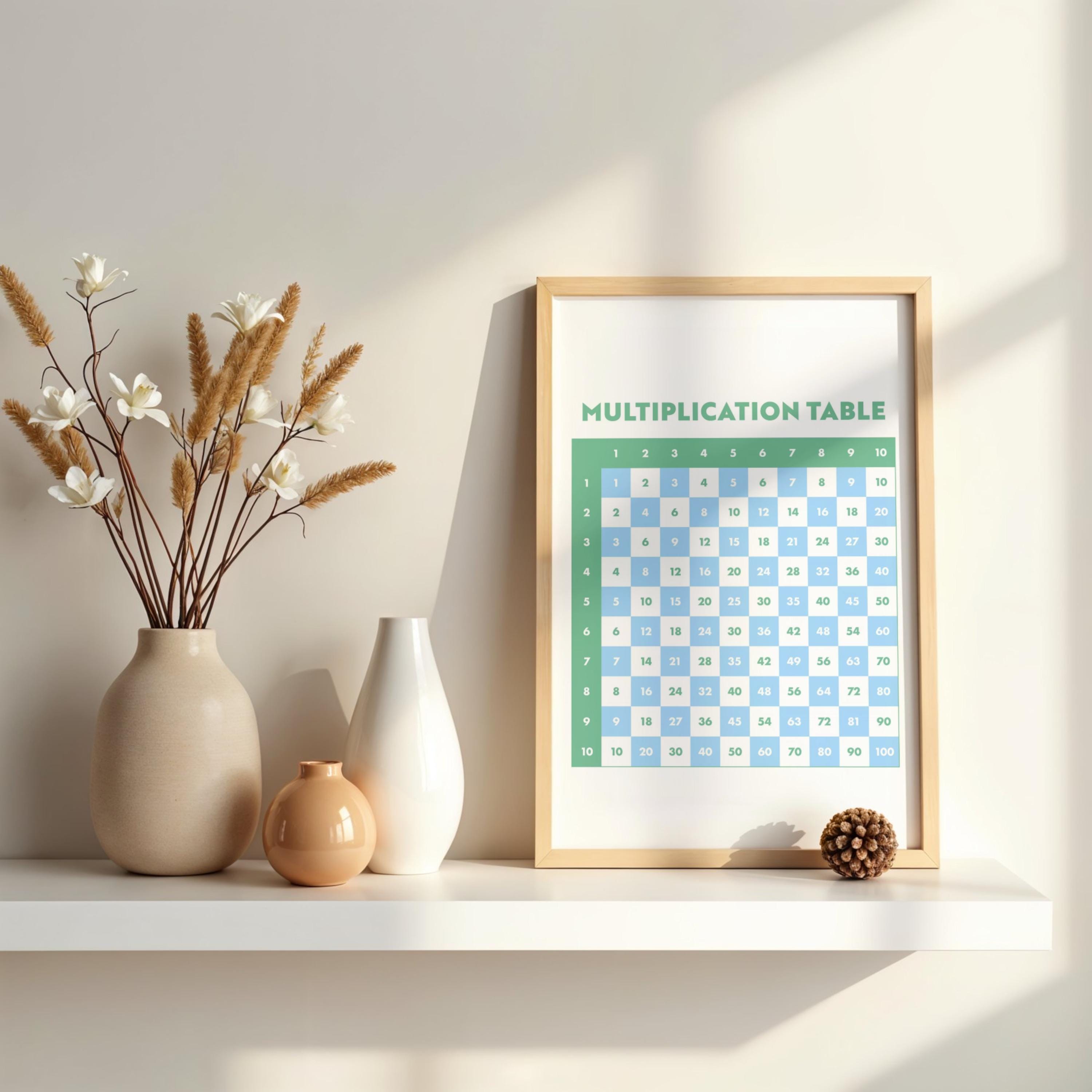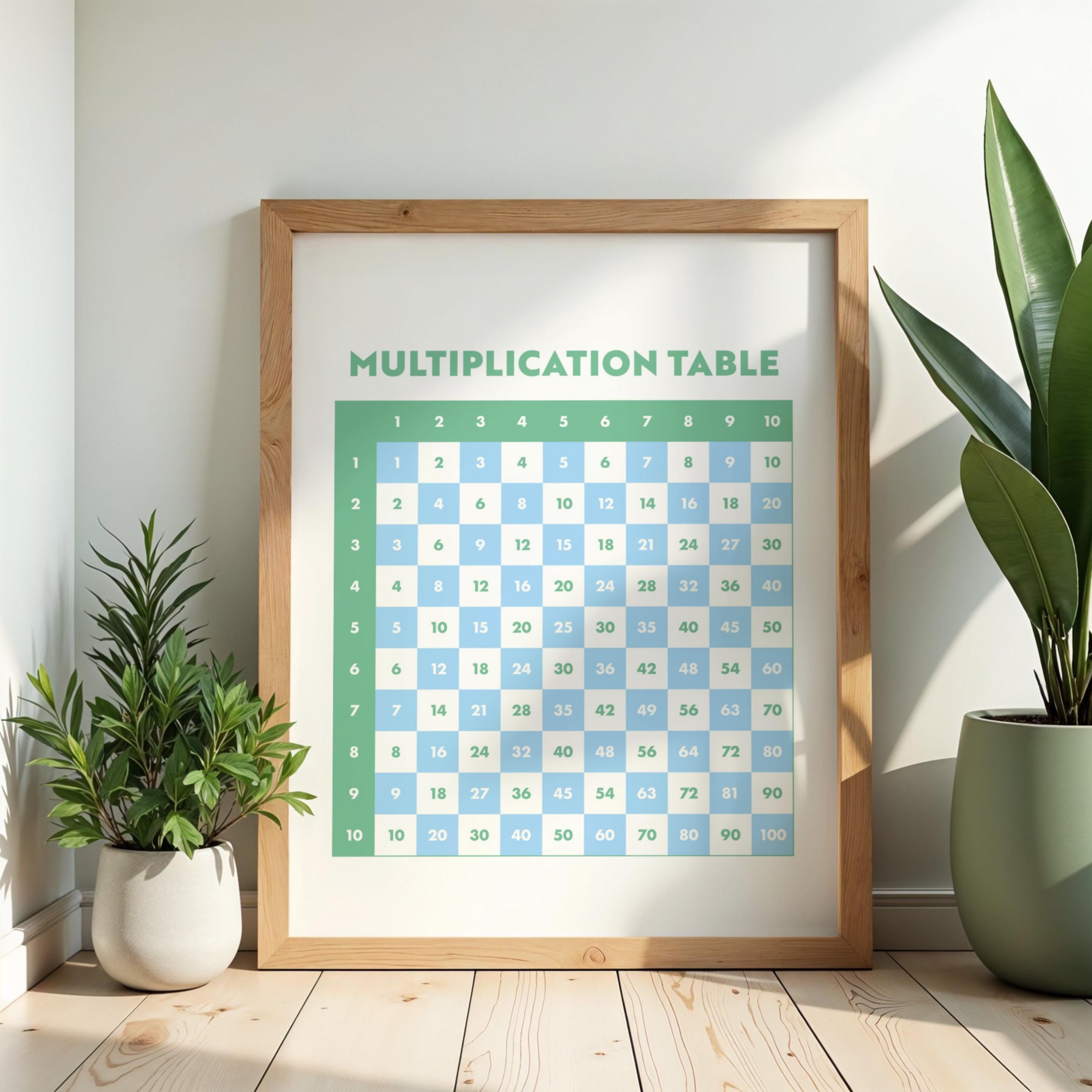 Master the times tables with style. This minimalist multiplication table features a classic checkered pattern with tricolor. A perfect blend of educational value and modern graphic design for your child's learning space.